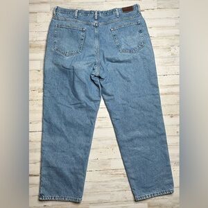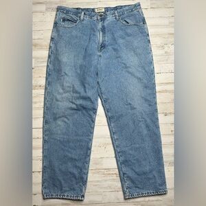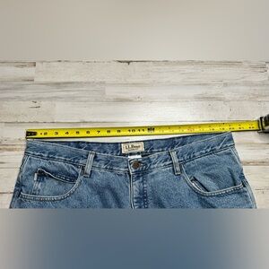 The product is a pair of L.L. Bean Men's Jeans in a classic fit, size 40x30, featuring a traditional blue color and made of heavy denim fabric. These jeans are lined with fleece for added warmth and comfort, making them suitable for all seasons. They have a 5-pocket design with a straight style and a zip and button closure. The jeans are machine washable and boast a solid pattern with a medium wash. Perfect for a rugged, outdoor look with a touch of 90s style, these L.L. Bean jeans are a versatile wardrobe staple.