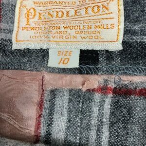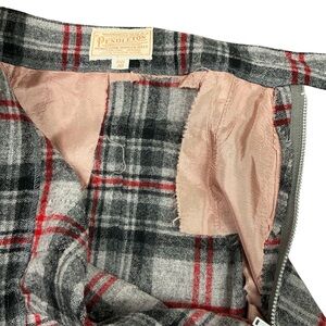 Vintage Pendleton 1960s turnabout gray and red plaid wool skirt. Made in the USA. 100% Virgin wool. Tagged as a size 10, measures as an XS. 11.5 inches across the waist, 17 inches across the hips, 24 inches in total length. Side button and zip enclosure. Steel Talon zipper. Overall excellent vintage condition, the inside lining needs to be repaired as shown in last photo. Not visible on the outside. Smoke and pet free home. 🇺🇸