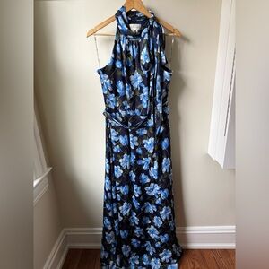 This is a Kayla gown by Sachin + Babi in a size 10. Slit up side. Hidden side zipper. Crinkle crepe floral fabric in blues. Tie at side of neck. Maxi gown length. Excellent condition with no known flaws. Polyester. Dry clean.