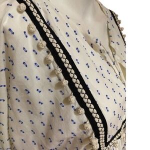This is a gorgeous dress that is lined, ties at the neck, (or not) is a mini with boho-y big sleeves, embroidery, & mini-“balls”