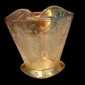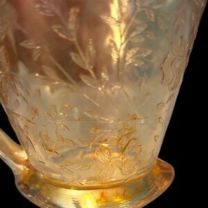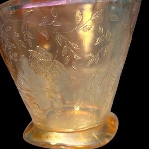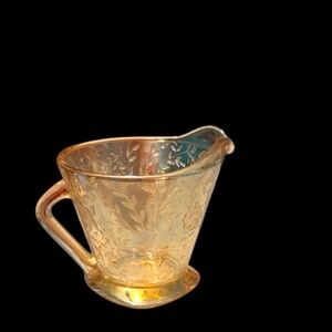 Enhance your coffee and tea experience with this elegant floral glass creamer. Its delicate gold hue adds a touch of sophistication to your kitchen decor. This vintage creamer is a collectible item from the mid-20th century “Depression Era” carnival glass revival.