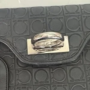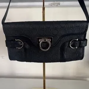 A striking vintage Salvatore Ferragamo shoulder bag crafted in black leather with an all-over embossed logo pattern. This structured silhouette features bold buckle detailing, polished silver-tone hardware, and the iconic Gancini ring clasp at the center, blending functionality with unmistakable Ferragamo design language.