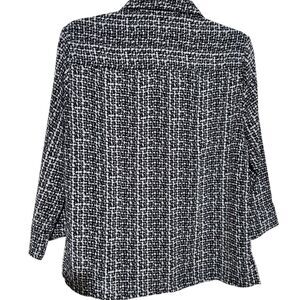 The Donnkenny Blouse for Women in size Small is a stylish and versatile top featuring a black and white color scheme, 3/4 sleeves, and a collared neckline with a button closure.