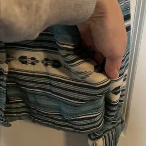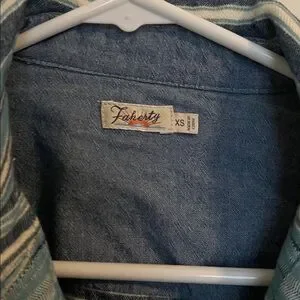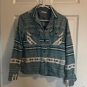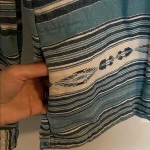 Stylish blue striped jacket. Features button closure and chest pockets. Perfect for layering. All buttons intact. Worn once. No visible flaws. Like new. Fits more like a small.