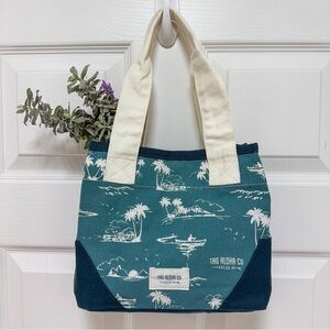 Available only in Hawai‘i. Limited edition Whole Foods Market Hawai‘i–exclusive mini tote, designed in collaboration with Tag Aloha Co. (Kailua, HI). This Mini Hawaiian Island tote features a hand-drawn island coastal scene with palm trees and shoreline details on teal canvas, finished with natural cotton handles and darker blue canvas trim — a classic island-inspired design celebrating Hawai‘i’s aloha spirit.