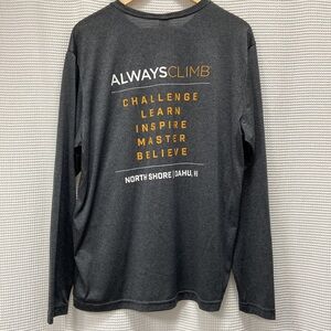 Climbworks Keana Farms zip line long sleeve shirt. Grey color with white and orange writing. Logo and writing in good condition with no cracks. Hawaii island and rock climber on the front with the motto “always climb” on the back. On the back it also says “challenge, learn, inspire, master, believe.” With the location of North Shore Oahu, HI. Material is 100% polyester and feels like an athletic silky dry fit texture.