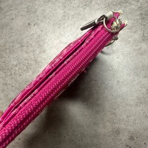 Authentic Coach signature jacquard card holder / coin pouch in a bright pink colorway with metallic silver trim. Features a top zip closure and attached key ring, perfect for cards, cash, or small essentials.