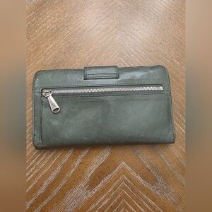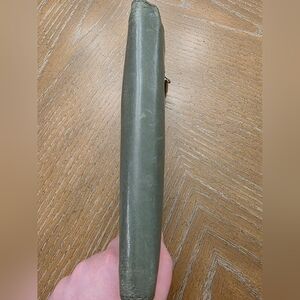 Measures 7.5" x 4". Vintage Hobo Danette wallet in a beautiful green color. Can be used as a bifold wallet or a wristlet. Wallet is a little worn but still in excellent condition. No holes or stains. No peeling, just slight wrinkles in the leather.