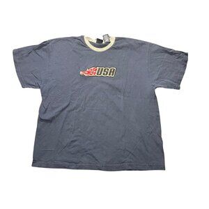This vintage graphic t‑shirt features a bold “USA” logo across the front, giving it a classic patriotic look. Sized XL, it offers a relaxed fit perfect for casual wear, 4th of July celebrations, or collectors of retro Americana apparel. The timeless design makes it a versatile piece that pairs easily with jeans, shorts, or layered under a jacket.