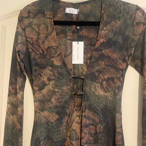 Sultry and romantic RESA maxi dress crafted in sheer mesh with an abstract earth-tone print. Designed with a deep plunge neckline, subtle front cutout detail, and elegant long fitted sleeves. Finished with a back slit for movement and drama. This piece is perfect for layering or styling as a bold evening look.