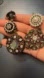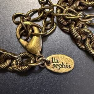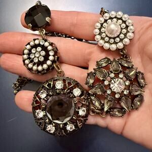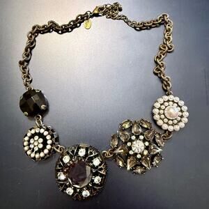 This is a stunning retired Lia Sophia bib necklace which exudes a romantic, Victorian gothic vibe. It features antiqued burnished brass-tone metal with faux pearls, sparkling glass rhinestones, and striking cabochons. It is in mostly strong condition but with one small flaw (two small pearls are missing). It measures 17" (with a 3-inch extender).