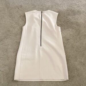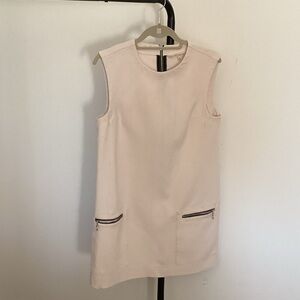 Chic cream mini dress with sleek zipper details. Sleeveless design for modern style. Perfect for versatile wear.