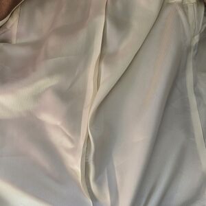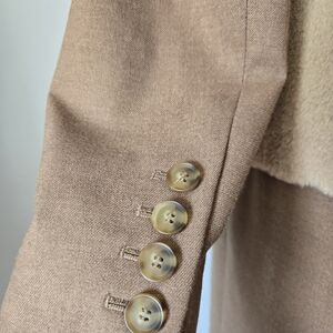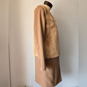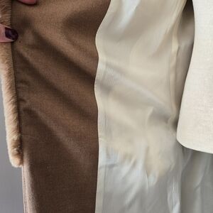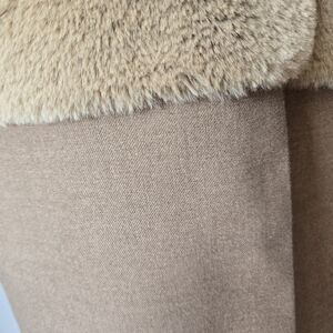 So gorgeous. Tan jacket with a super soft faux fur body. Open front and lightweight. Back slit is still sewn from purchase. Fully lined in cream