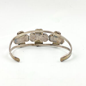 This vintage native Zuni cuff bracelet features three flower-shaped embellishments. Each flower has white mother-of-pearl petals and a central turquoise inlay. The bracelet has an open-back design, allowing for adjustability. In great vintage condition. It measures 2 inches across but can be slightly bent to fit various wrist sizes.