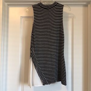 This is a White House Black Market mock neck top in black and white stripes. It stretchy and sleeveless. It has a zipper in the back.