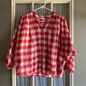 Oversized red & white gingham top by Doen. Billowy sleeves. Button-up front. From Heather Taylor collab.