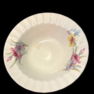 Elegant earthware china bowl with a beautiful floral design. Perfect for adding a touch of color to your dining table. Made in the 1940’s, and now discontinued, the pattern is referred to as Iris or Spring Bouquet.