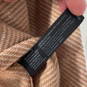 Elegant tan sweater with a cozy cowl neck. Ideal for layering. 70% recycled cashmere 25% virgin cashmere and 5% merino wool. This item is in great condition overall, does not have much wear. But it does have some flaws. It has 3 tiny holes shown in the front and two on the left arm. You can also just wear the sweater backwards . There are no holes in the back. Great neutral color made of natural fibers. Sustainable brand. Great to have as a layering piece. From the website this piece would retail at $395+ on average. This is a great price considering the small flaws and retail value