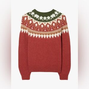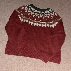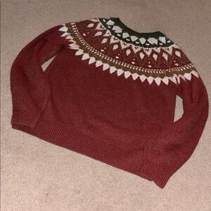 Chic and warm sweater with intricate patterns. Features rich red and green tones. Ideal for casual wear. Has pilling at the top, but if you have a pilling vacuum, it’ll look good as new.