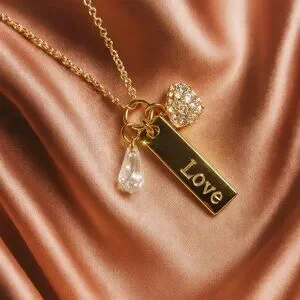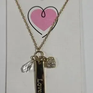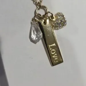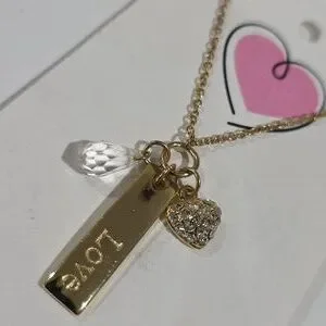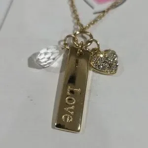 Add a touch of romance with this Gold Love Pendant Necklace, featuring three elegant charms: a polished gold bar engraved with "LOVE," a sparkling crystal heart, and a faceted teardrop accent. Perfect for everyday wear or gifting, this necklace brings shine and sentiment to any outfit. A thoughtful jewelry piece for birthdays, anniversaries, or just because.