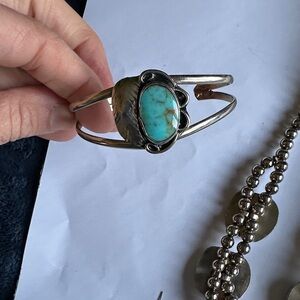 vintage native southwest I have not tested the metal or the stone, all I know this is beautiful and perfect for any occasion as is please let me know if you have any questions Elegant turquoise and silver jewelry set featuring a necklace, bracelet, and earrings. Perfect for adding a pop of color to any outfit. light weight costume jewelry