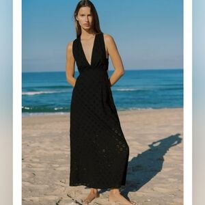 Elegant black midi dress. Sleeveless with a deep V-neck. Perfect for beach outings.