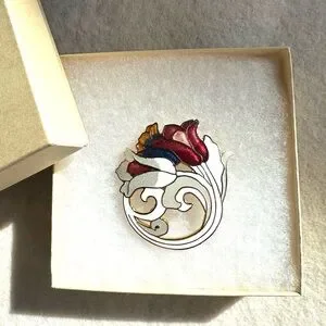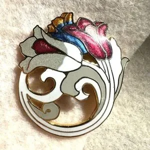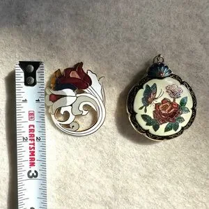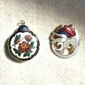 This is a set of 2 cloisonne pieces. One is a puffy pendant and the other is a brooch. Beautiful colors and images. Measurements can be seen in one of the photos. The jewerly comes in boxes as shown in the pictures. Excellent condition. 🌸