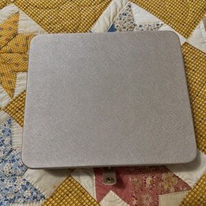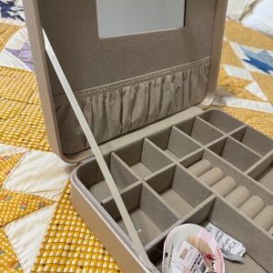 The Opal Jewelry Travel Case in Golden Mist, is a must-have for any traveler or even home use. Its plush anti-tarnish felt lining and gold sparkle accents keep your jewelry looking stunning. With divided compartments, ring roll holders, and an elastic pocket in the lid, your jewelry stays organized and protected. Plus, there’s a mirror for quick touch-ups on the go. Treat yourself or someone special to this perfect travel companion.