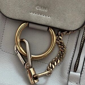 The Chloe Faye Mini Suede Leather 2-Way Shoulder Backpack in Airy Grey is a stylish and versatile accessory for women. Made from luxurious leather and suede, this mini backpack features a magnetic closure and shoulder strap handle style, making it easy to carry on the go. The solid gray exterior color and designer theme of the Chloé Faye collection add a touch of sophistication to any outfit.
