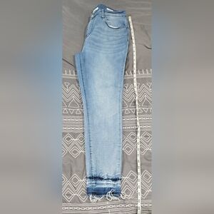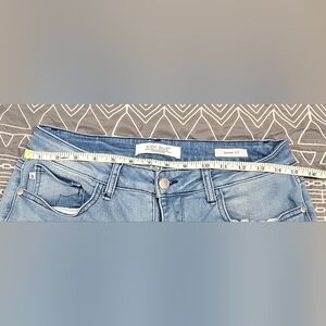 Great condition. Size 9/29. Skinny fit. Released hem. Light wash denim with whiskering details. Darker hem. Measurements and fabric content listed above in pictures.
