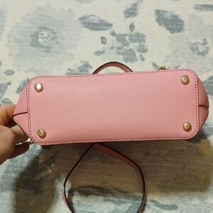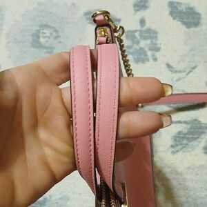 Elegant pink mini bag with gold chain accents. Perfect for a chic look. flawless on outside, two markings on lining as pictured in last 2 photos. blush pink. measurements are 8"L ×8"H.