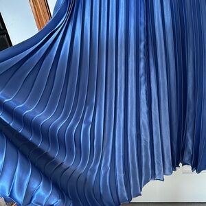 This stunning gown has a halter top with padded cups. The bodice is covered in beads and rhinestones and it has a stunning periwinkle pleated satin skirt. It zips up the back and has been cleaned. I removed the tag, but measurements are below: