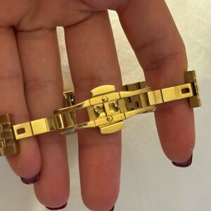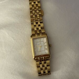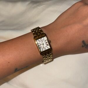 Elegant gold watch with a rectangular face and Roman numerals.