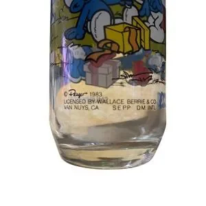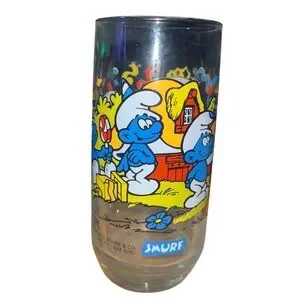 This specific design features several happy Smurts in a testive party scene, complete with presents and a lollipop. It's a charming piece of 80s nostalgia and the pertect addition to any Smurts or vintage glassware collection.