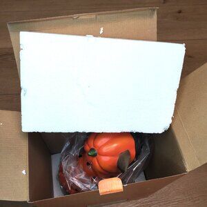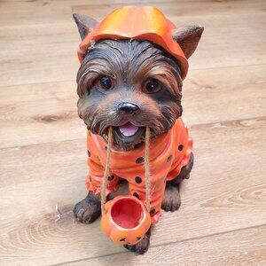 Good preowned condition. Indoor and Outdoor use. Stored in original box. Super cute Yorkshire Terrier wearing an orange polka dot costume, holding a pumpkin on a rope. Pumpkin has a hairline crack, shown in photos.