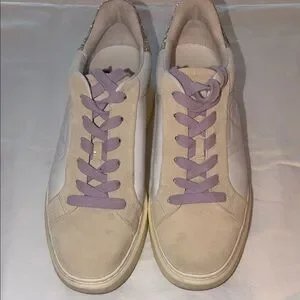 Stylish athletic shoes with beige suede and gold glitter accents. Features white leather panels and light purple laces. Perfect for casual wear.
