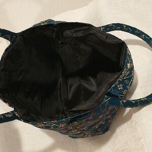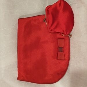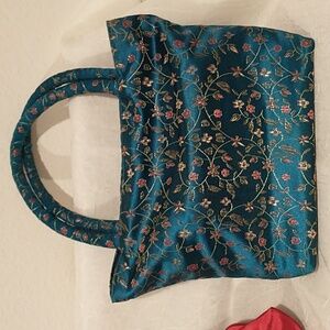 This elegant set features a floral silky blue handbag and a vintage MM silk red evening clutch.