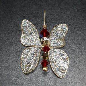 This whimsical winged butterfly pendant features sparkling Swarovski crystals in vibrant ruby red and gold tones, creating a stunning and eye-catching effect.