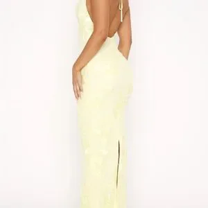 Chic maxi dress with floral patterns. Light yellow hue. Perfect for any event.