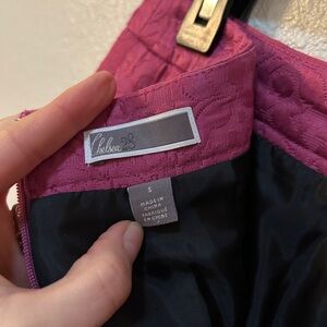 Vibrant fuchsia skirt with intricate brocade texture. A-line silhouette for a flattering fit with pockets and fully lined. Zipper and eye-hook closure. Excellent condition.