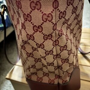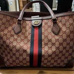 Elegant Gucci tote featuring signature GG pattern. Brown leather handles and red stripe detail. Clean, authentic and in Excellent condition