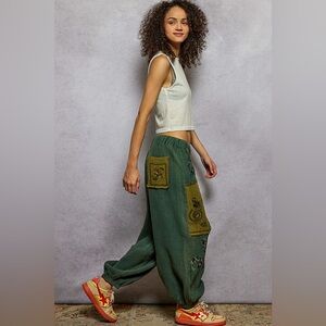 Designed in a roomy, relaxed fit, these pants feature delicate floral embroidery and patch detailing that add handcrafted charm. The double gauze fabric ensures a soft, breathable feel. These pants keep you cool and comfortable all day long - soft against the skin and naturally airy for effortless wear. The multiple pockets enhance both function and style. Pair them with a simple tee, cropped sweater, or boho blouse for an effortlessly chic, vintage-inspired outfit.