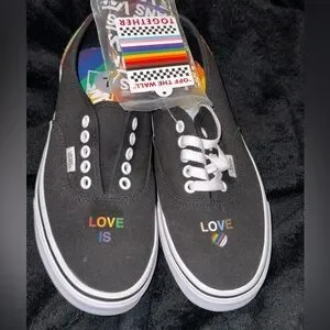 Celebrate pride and unity with these Vans Pride Collection shoes. These shoes are size 12 for men, featuring a striking black canvas upper with "LOVE IS" in rainbow colors. They are in new condition with tags, perfect for showing your support and adding a pop of color to your outfit.