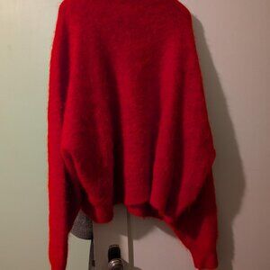 Super soft red brushed knit sweater with a round rib crew neck, long sleeves, drop shoulder, rib hemband, and rib cuff band.