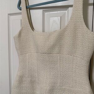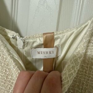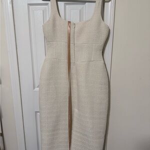 Chic cream midi dress by Meshki. Features a textured design and structured design waist. Perfect for stylish outings.