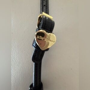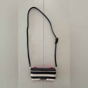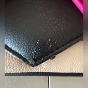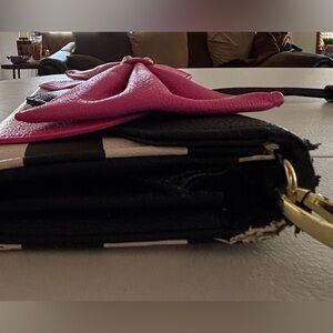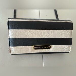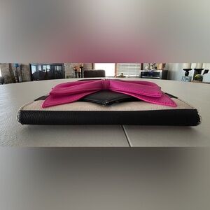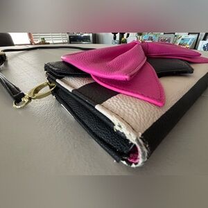 Women’s BOW NANZA handbag by Betsey Johnson. Flap ever, magnetic snap closure. The interior has 12 card slots. 1- bill slot. 1- zippered coin purse. Detachable strap. Gold tone hardware. The edges do have some peeling. See pictures. Good, used condition.