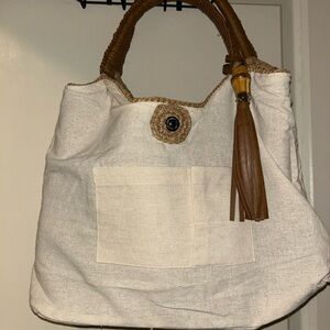 Stylish and versatile brown woven tote bag perfect for any occasion. Features a comfortable handle, chic design, linen interior. Brand new!