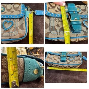 Elevate your style with this chic Coach women's bag. Featuring a sophisticated brown and teal design, this bag is perfect for any occasion. The elegant pattern and quality craftsmanship make it a must-have accessory. Very clean! Barely used. 2ft strap that can be easily shortened. Coach heart pin came with bag. Totally unique and gorgeous! Like new. See all pictures for details.