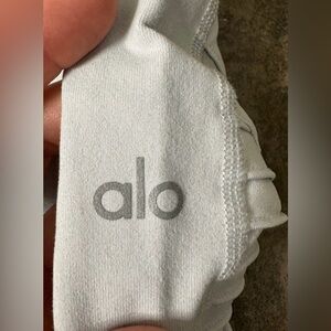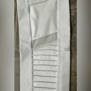 Alo Yoga Moto leggings in a soft white / dove gray shade. Features the signature ribbed moto detailing and sleek performance fabric. Super flattering and perfect for workouts or athleisure wear.