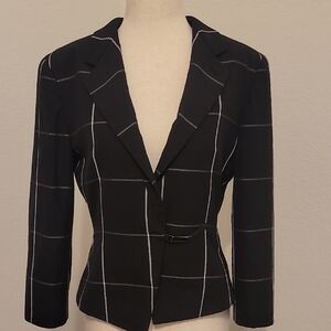 Elegant black blazer featuring a white grid design. Perfect for professional and casual looks. EUC